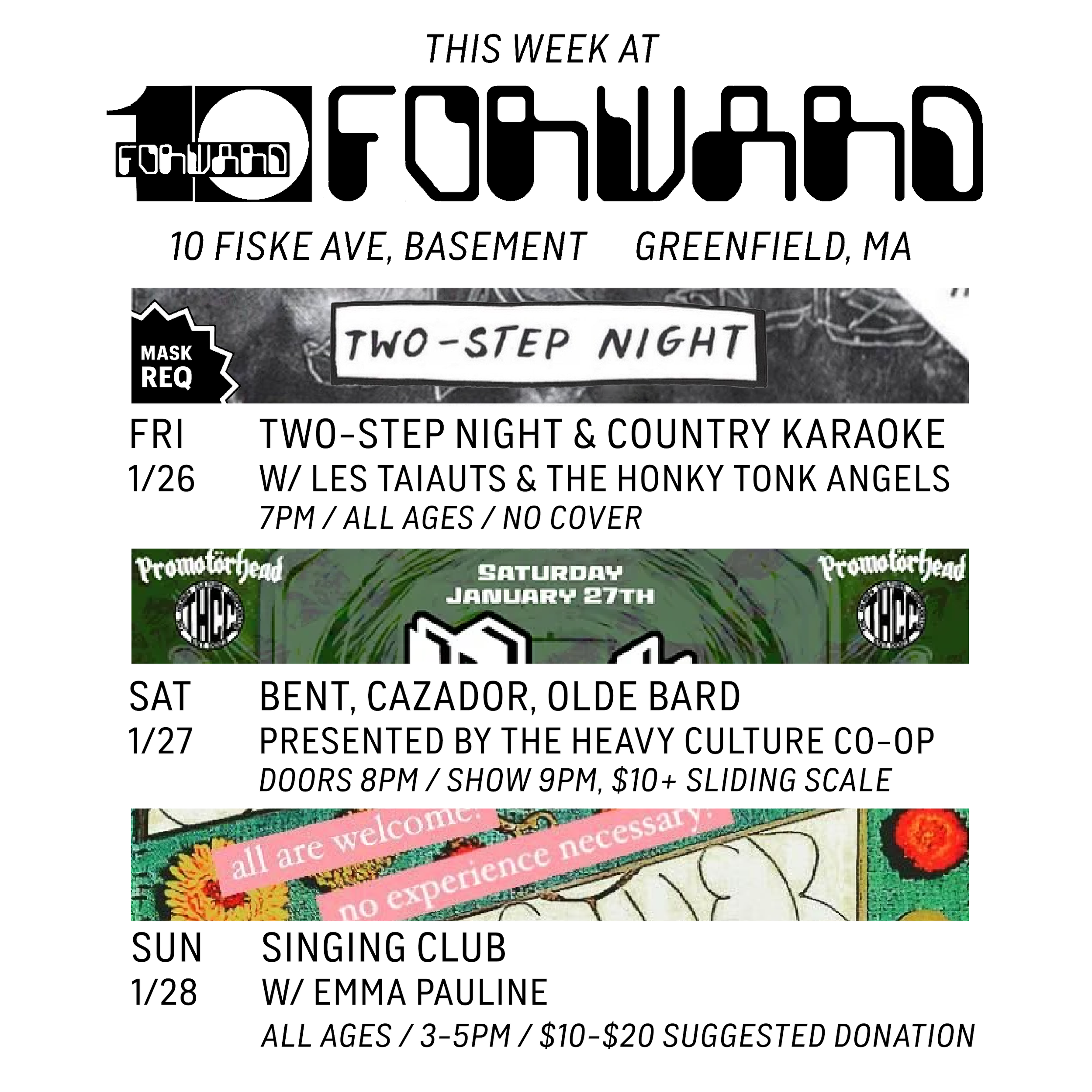 10 Forward will be closed Jan 1st-25th, 2024. We'll be back January 26th with our monthly Two-Step Night!